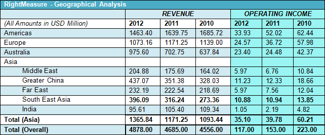 At the consolidated group level, we posted a growth of 2.47% in Net Profit Margin in the past year, compared to 3.26% the previous year. Geographically, both revenue and operating income in mature economies (Americas and Europe) have been falling. Competition has ensured that our margins are always under pressure in these markets. Asia and Australia have both recorded consistent increases in revenue; however, with an unfavorable cost structure, these markets are not immune to threats on the profit margin.