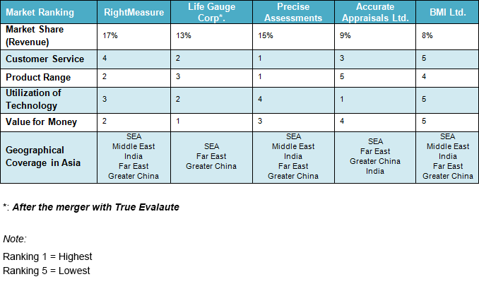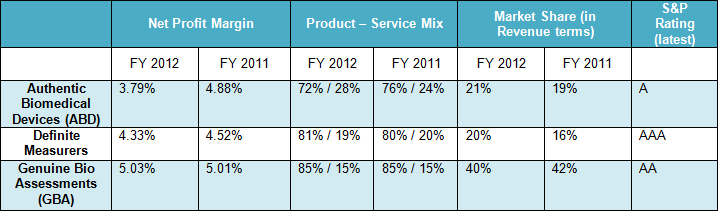 The second opportunity is with Genuine Bio Assessments (GBA) which has been a long time player in the Mandawian market. They were once the unchallenged leaders in the life science equipment field; however due to new entrants, the current market share now stands at 40%. GBA, which was family owned, went public two years ago. The second generation promoters of GBA had decided to go public to raise money to modernize the company and bring in the latest technology from outside. GBA had tied up with Precise Assessments for this. GBA is traditionally known for providing value for money products. GBA has marginal presence in the services business line with only repair & calibrations and maintenance.