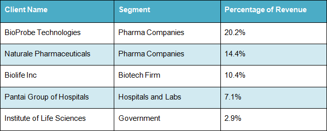 The top 5 clients of Scaler account for almost 55% of the revenues. The revenue share of the top 5 clients in the year 2012: